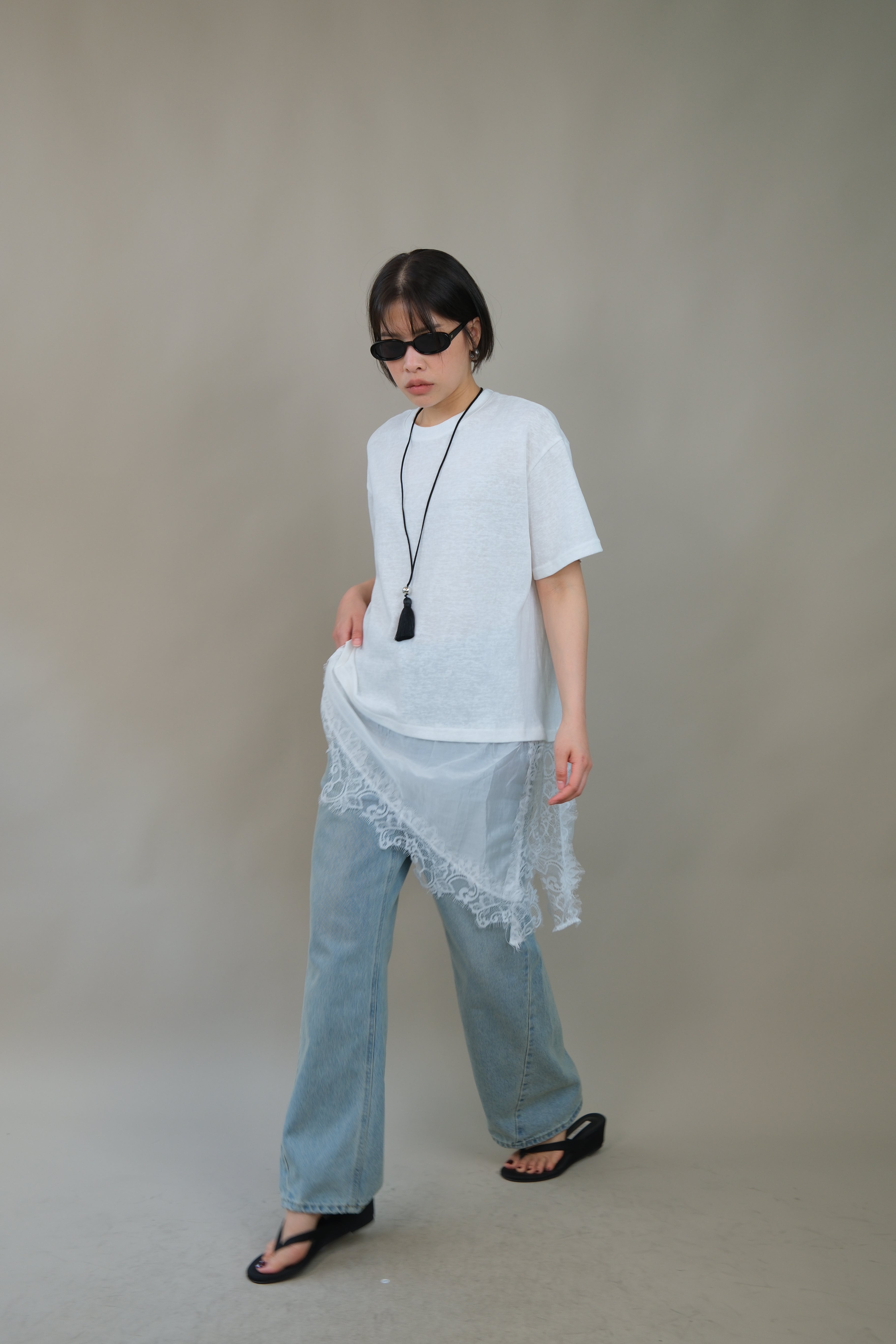 Cotton blend Asymmetric Lace Satin Hem Tee